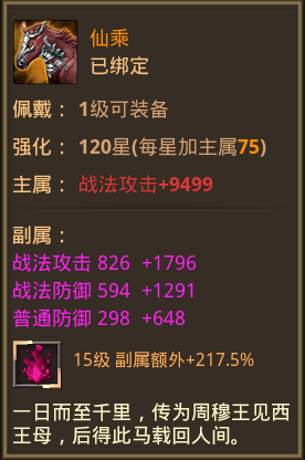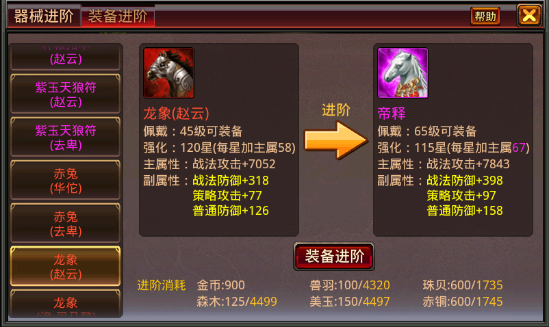 2. 红色装备可进阶为紫色装备,例如:任意红马均可进阶为紫马帝释;