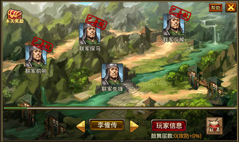 2. 过关斩将有很多关卡,每个关卡有30名守兵与1名守将,玩家只需击败某一关中的守兵就能通过本关,可领取本关通关奖励,并可挑战下一关;